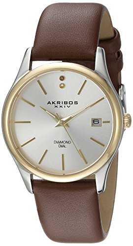-. Binding : Watch -. Brand : Akribos XXIV -. Color : Brown/Gold -. Department : womens -. EAN : 0848572072519 -. Feature : Silver radiant sunburst dial with three hand movement and date window at 3 o'clock position / Individually hand applied gold tone stick markers with luminous filled gold tone hour and minute hands / Polished two tone stainless steel case with onion style crown and brown genuine leather strap / Japanese quartz movement with analog display / Water-resistant to 30 M (100 feet) -. Label : TWI Watches, LLC -. Manufacturer : TWI Watches, LLC -. Model : AK879BR -. MPN : AK879BR -. PackageQuantity : 1 -. PartNumber : AK879BR -. ProductGroup : Watch -. ProductTypeName : WATCH -. Publisher : TWI Watches, LLC -. Studio : TWI Watches, LLC -. Title : Akribos XXIV Women's AK879BR Diamond Accented Silver & Gold Tone Stainless Steel Brown Leather Two Tone Strap Watch -. UPC : 848572072519