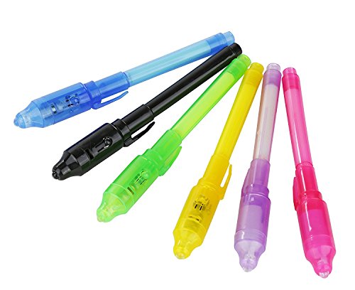 This magical invisible ink pen will write your secret message. Once your secret message is written with this invisible ink pen wait a few seconds shine the light from the cover of the pen and REVEAL MYSTERY OF THE SECRET MESSAGE. Kids will love these spy pens. Kids love using this kind of pen to keep their secret and play detective spy games. Invisible pen brings you an amazing variety of fun activities. From Surprise birthday parties, to reviling a top secret message to their parents or grandparents. Assorted colors to make the activity more exciting and fun. Parents can buy it for their kid's party at home. Schools, Teachers can buy it for students for a school Activity. Add it for any surprise gift bag or as Stock Stuffers. PACKAGE INCLUDES: 7 invisible magic pens with built in UV lights. Batteries included and installed. Pens will come in a variety of colors to keep the activity exciting. 0 |