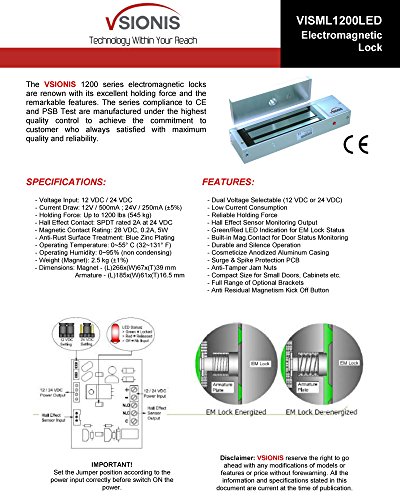-. Feature : (1) VIS-ML1200LED: 1200lb Indoor Electric Lock with LED Sensor / (1) VIS-8004: 1-Channel Receiver 315mhz 11-24 VAC/DC / (2) VIS-8005: Fixed Code Transmitter, Pre-coded Wireless Remote / (2) VISCP100: 12v 1000ma Power supply / (1) VIS-7000: Illuminated green 2" square. SPDT switch, 10A@125~250VAC. Stainless-steel single-gang plate. 2 year warranty, Links to Install Videos provided in package, 100% USA Lifetime tech support, Quick-guides made by USA techs, 60-day return policy with no questions asked