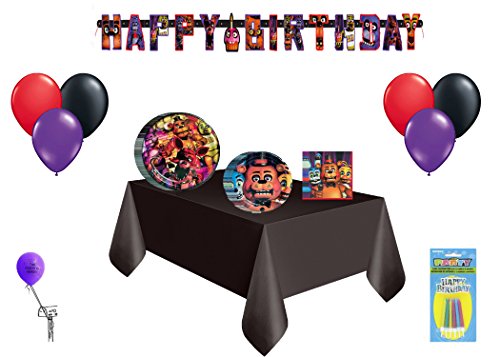 -. Feature : 16 Lunch Plates, 16 Lunch Napkins / 16 Dessert PLates, 1 Black Plastic Table cover / 2 Purple, 2 Red, 2 Black Round Latex Balloons ***NO HELIUM INCLUDED*** / 1 Five Nights At Freddy Happy Birthday Banner 6FT, 1 Pack of Happy Birthday Candles / 1 "The Party Is Here" Latex Balloon (Colors May Vary) ***NO HELIUM INCLUDED***