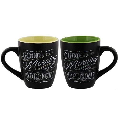 -. Feature : Set of 2 / Material: Ceramic / Each holds 11 oounces / Includes one 'Good Morning Handsome' & 'Good Morning Gorgeous' / Dishwasher and Microwave Safe