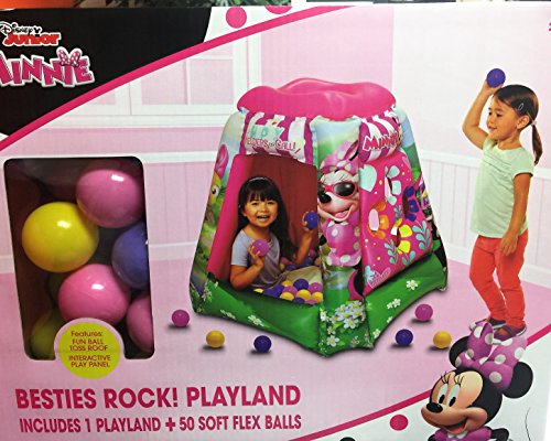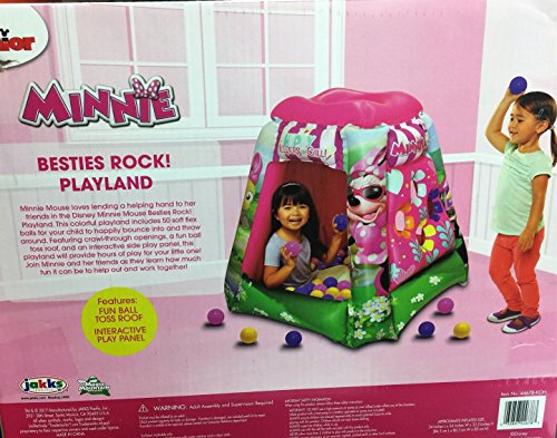 Studio : Jakks Publisher : Jakks Binding : Toy Product Description Besties Rock! Playland Minnie Mouse loves lending a helping hand to her friends in the Disney Minnie Mouse Besties Rock! Playland, This colorful playland includes 50 soft flex balls for your child to happily bounce into the throw around. Featuring crawl-through openings, a fun ball toss roof, and an interactive side play for your little one! Join Minnie and her friends as they learn how much fun it can be to help out and work together! 0