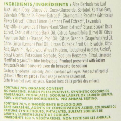 - Lemon essential oil, chamomile, aloe and vitamin E purify and refresh with every wash^Soothing but effective botanical cleansers are blended with moisturizing glycerin and naturally antibacterial lemon^Gentle enough for frequent hand washing^Cruelty-free cosmetics, no animal testing and 100% vegetarian^NSF/ANSI 305 certified organic established specifically for personal care products
