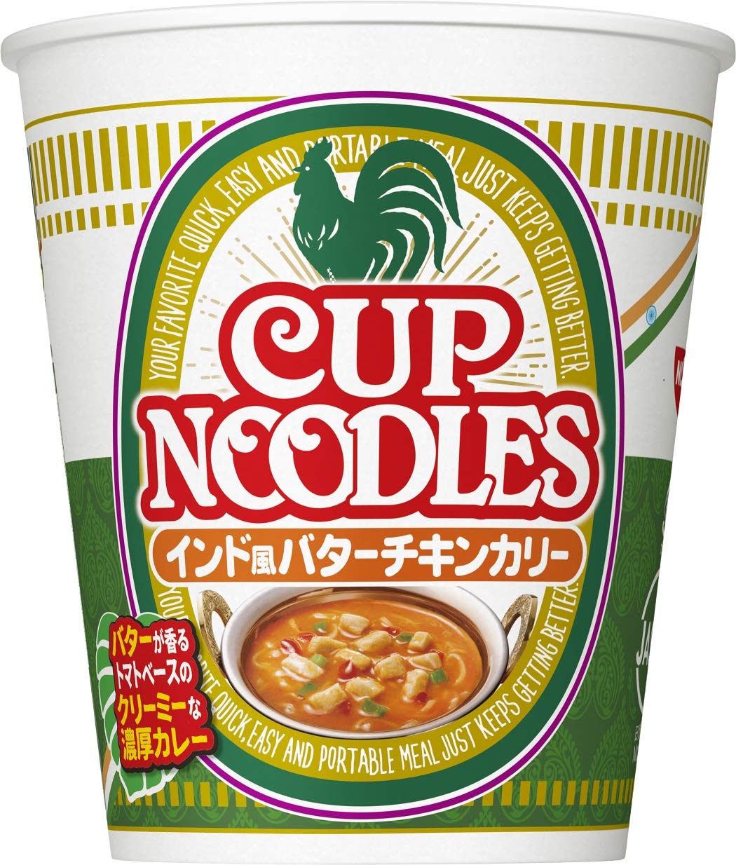 原材料:油揚げめん(小麦粉、植物油脂、食塩、糖類、しょうゆ、チキンエキス、ポークエキス、たん白加水分解物、ポーク調味料)、スープ(豚脂、糖類、小麦粉、でん粉、植物油脂、乳等を主要原料とする食品、玉ねぎ、クリーミングパウダー、香味調味料、フルーツペースト、ポーク調味料、トマトパウダー、香辛料、酵母エキス、ピーナッツバター、バターオイル)、かやく(味付鶏肉、赤ピーマン、ねぎ)/加工でん粉、調味料(アミノ酸等)、乳化剤、香料、酸味料、炭酸Ca、カロチノイド色素、増粘多糖類、かんすい、酸化防止剤(ビタミンE)、甘味料(スクラロース、アセスルファムK)、カラメル色素、ビタミンB2、ビタミンB1、(一部に小麦・乳成分・落花生・大豆・鶏肉・豚肉・りんごを含む)