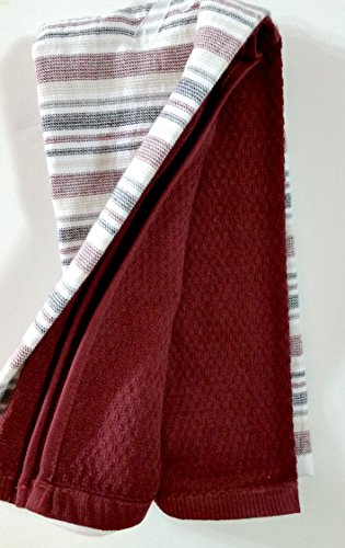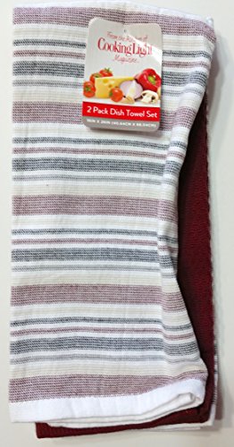 Cook Light 2 Pack Dish Towel Set 26 inches long x 16 inches wide one printed and one solid color (Stripe/Wine)