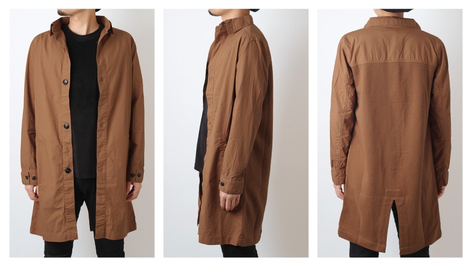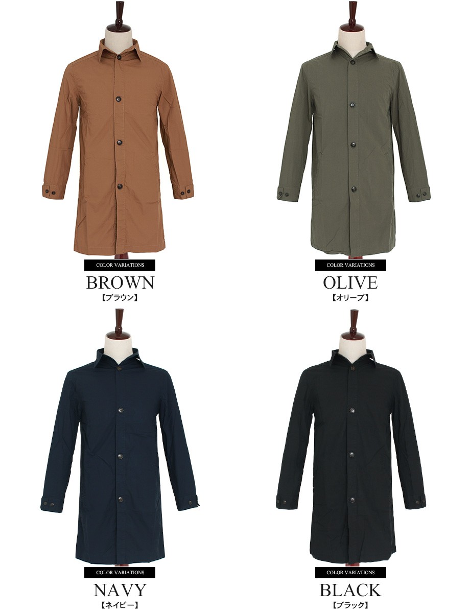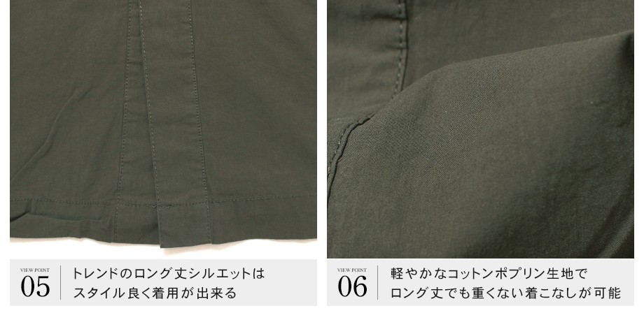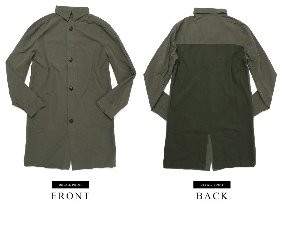 軽やかな生地感でスタイル良いコーディネイトが作れるロングコート。コットンポプリンの生地を使用しておりロング丈でも野暮ったくない印象のライトアウター。都会的な大人の雰囲気を醸し出す上品な仕上がりになっております。バックスタイルはストレッチ性のあるコットン生地で切り替えられており着心地の良さも感じるコートです。