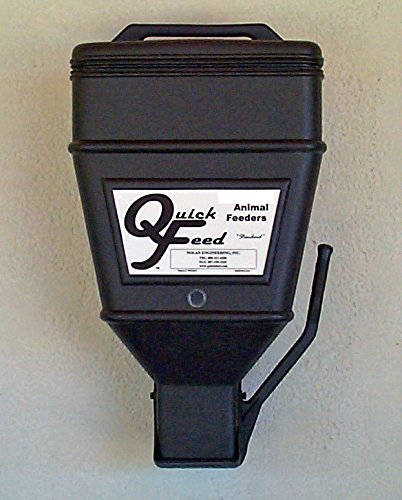 Studio : Quick Feed Publisher : Quick Feed Binding : Misc. Product Description Wall mount storage hopper, stores then pours any dry material. Dispenses charcoal, dog food, cat food, pellets, grain, rock salt, bird seed, and many other dry materials. Made of high density polyethylene. This manual dog feeder comes complete with lid, manual pour lever large measuring cup. 0