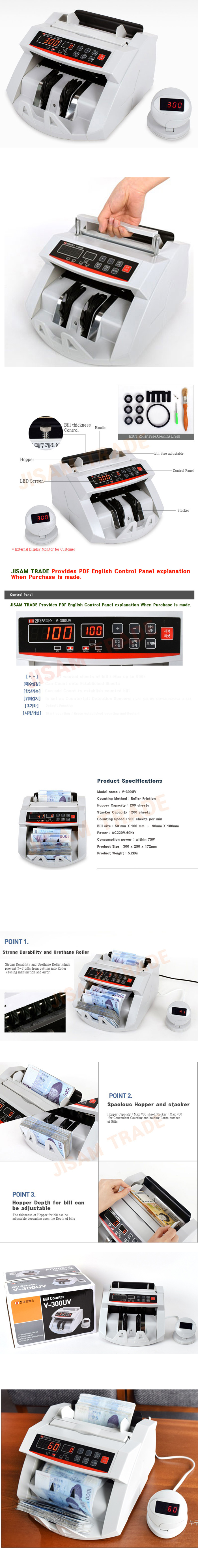 Model name : V-300UV Counting Method : Roller Friction Hopper Capacity : 200 sheets Stacker Capacity : 200 sheets Counting Speed : 900 sheets per min Bill size : 50 mm X 100 mm ~ 90mm X 180mm Power : AC220V,60Hz Consumption power : within 75W Product Size : 300 x 250 x 172mm Product Weight : 5.2KG