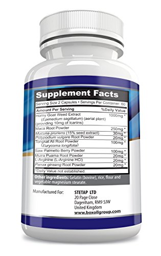 EXTRA STRENGTH FORMULA- This powerful unique Horny Goat Weed blend contains concentrated and exotic ingredients including Maca Root Complex, Ginseng, Saw Palmetto, L-Arginine and more to enhance your libido and sex drive, sexual performance and boost your energy more than any other supplement on the market.