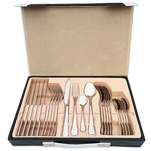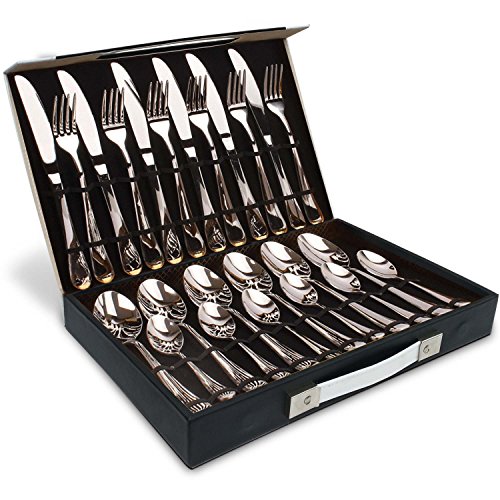 Flatware Set, Magicpro Modern Royal 24-Pieces silver Stainless Steel Flatware for Wedding Festival Christmas Party, Service For 6 packed in leather box