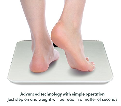Instant Results - Unique step-on technology enables scale to power on upon contact. Place on a hard level surface and step on, within seconds an exact weight reading will be displayed- no tapping necessary!
