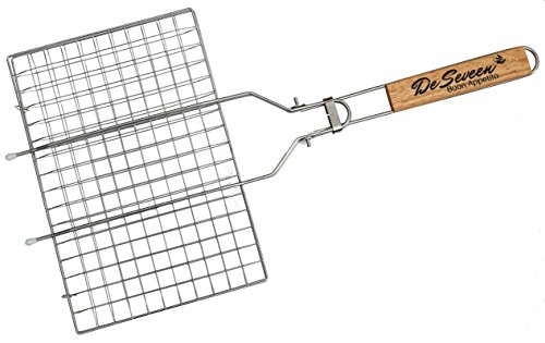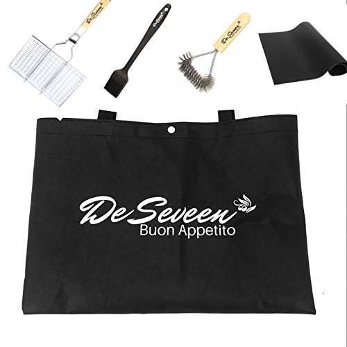 De Seveen BBQ Grilling Basket Set Includes Grill Mat, Grill Brush, Silicone BBQ Basting Brush and Free BBQ Grilling Basket 430 Stainless Steel Removable Wooden Handle