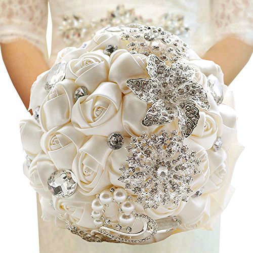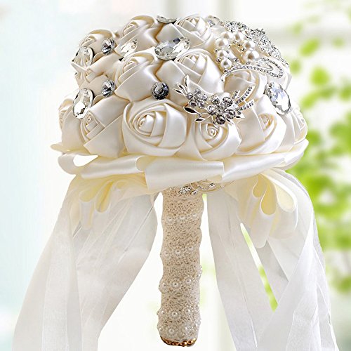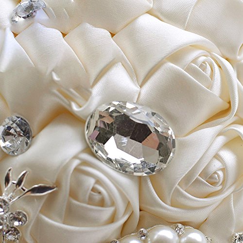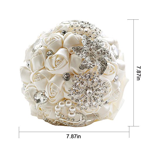 Sisjuly 7.9" Diameter Wedding Bride Holding Bouquet Roses Flower with Diamond Pearl Ribbon Ivory