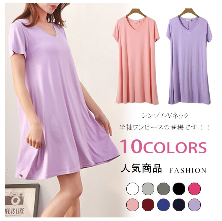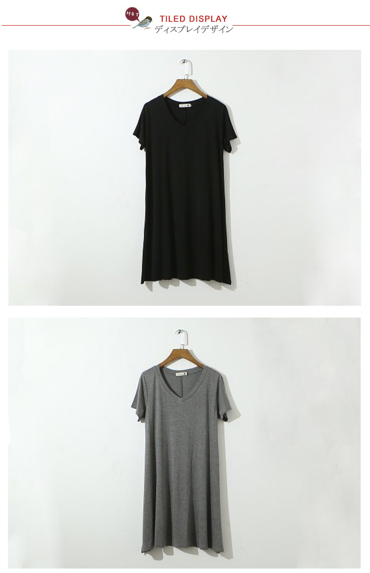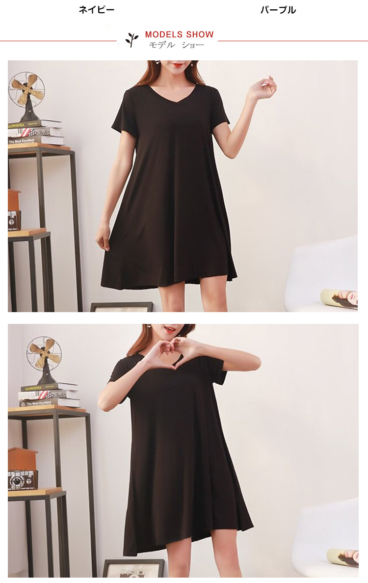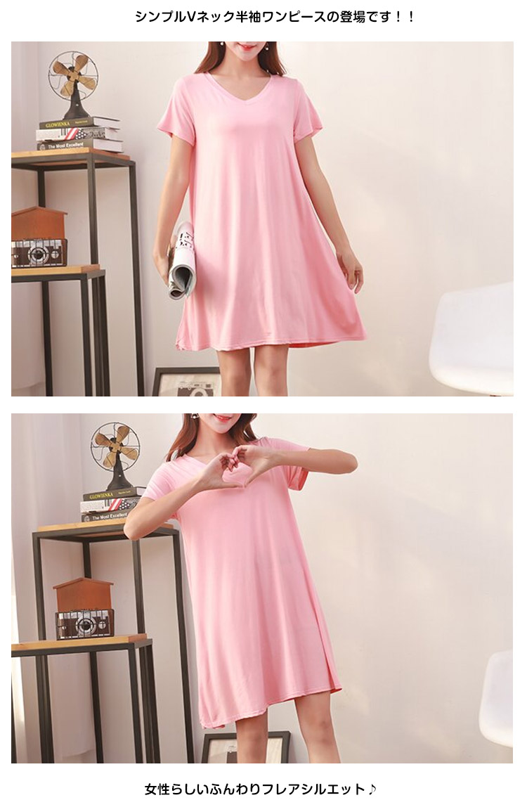 | シンプルVネック半袖ワンピースの登場です!!女性らしいふんわりフレアシルエット♪薄すぎず厚すぎない肌触りも柔らかなカット地で着心地も抜群です!!このシルエット、妊婦さんのマタニティ服としても大活躍!臨月近くの大きなお腹を目立たせずふんわり優しく包み込んでくれるんです。 | |