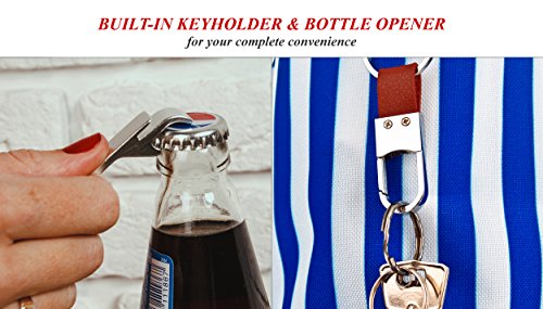 - LARGE & ROOMY w/ BIG ZIPPERED INNER POCKET, WATER REPELLANT INTERIOR LINING - sized at L22"xH15"xW6", there is plenty of space to securely store your wet beach towels, outfits, lotions, lipstick, cosmetics, magazines, other accessories. BUILT-IN KEYHOLDER & BOTTLE OPENER for your complete convenience