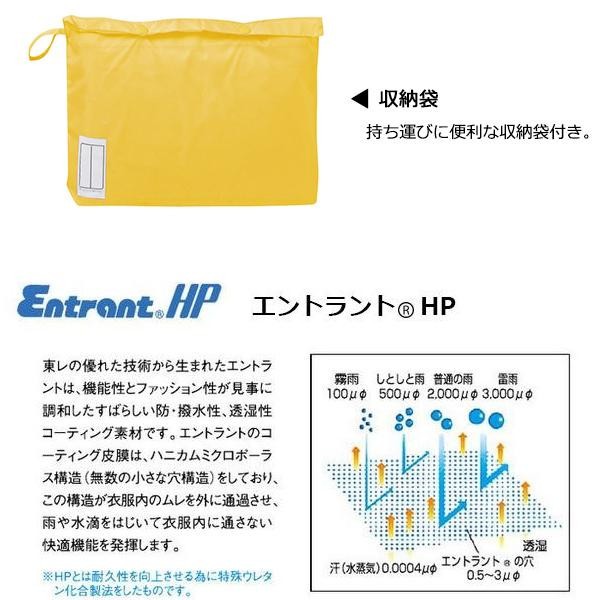 東レの生地「エントラントHP」を採用した強力防水・透湿素材の高性能レインウェアです。透湿素材使用でムレにくく通気性抜群。しかも、メッシュ裏地でサラッと快適です。左脇ファスナー開きで着脱がしやすく、ズボン裾のホックで絞りが調節可能です。燃焼の際、有毒なガスを発生しない地球環境にやさしい低公害素材です。 |