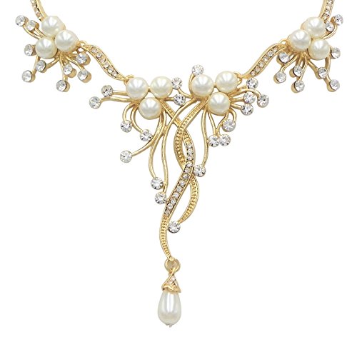 -. Binding : Jewelry -. Brand : Rosemarie Collections -. Color : Gold Color -. Department : womens -. Feature : Gold tone statement necklace and drop earrings set with a pretty floral design / Collar necklace 16" length with 2.5" extension, decor 2.5" length / Matching pearl stud earring; 1" length / Featuring clusters of cream colored faux pearls and sparkling crystal rhinestones / Beautiful bridal jewelry set is also great for prom, special occasions or evenings out -. Label : Rosemarie Collections -. Manufacturer : Rosemarie Collections -. Model : WT-1424-40XX -. MPN : WT-1424-40XX -. PartNumber : WT-1424-40XX -. ProductGroup : Jewelry -. ProductTypeName : FASHIONNECKLACEBRACELETANKLET -. Publisher : Rosemarie Collections -. Studio : Rosemarie Collections -. Title : Rosemarie Collections Women's Vintage Style Flower Faux Pearl and Rhinestone Jewelry Set