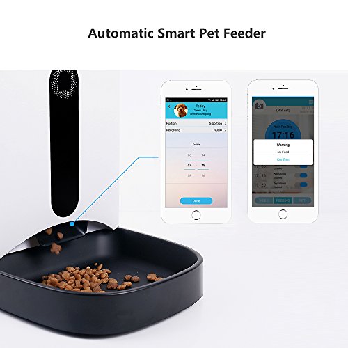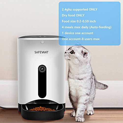 -. Feature : MULTI-FUNCTIONAL SMART PET FEEDER: Free app for Android and iOS, device user manages the application to feed pet automatically or manually, care about your pet Anytime and Anyplace. Moreover, it also work as a smart pet camera with a connected app that lets you see, talk, play with your pet. / KEEP AN EYE ON YOUR PET: Connect with your pet while you are away with the supported dual-way audio chat/recording or with the included HD camera. Take photos and videos of them with just the touch of a button. Sharing your favourite moment on social media directly. / USER FRIENDLY APP AND EASY SETUP: Simple to program the feeding schedule for your pet. To setup feeding intervals and control portion of each meal. Detachable feeding tray for easy cleaning and made with proper size to prevent the mess. Perfect for owner who is on vacation or hard to maintain a regular feeding schedule. / AUTOMATIC AND MANUAL FEEDING: Suitable for dry food only and the food size should be from 0.2-0.59 inch. Up to 4 meals and one meals up to 10 portions for automatic feeding. Up to 10 portions each meal for Manual feeding via app. Offline Feeding Model will distribute food based on your setting when Feeder isn't connected to Wifi. Record and save your voice to call her/ him over for meal, then it will auto-play on time. / KINDLY REMINDER: Videos and pictures can be saved on phone or external at most 32G TF card. Operates on standard 2.4ghz Wi-Fi network only, not supporting 5ghz. Powered by AC power adapter (included) or 3 D batteries (not included) when power cut. Any concerns, our support team is available at 1-866-380-1888 or at safevantservice@hotmail.com