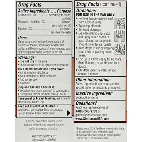 Homeopathic 100% Natural Active Ingredients Ear Drying Aid, Relieves the Symptoms of Clogged Ears Original Swiss Formula The sensation of clogged, full, and troublesome ears can be distracting and annoying. Get soothing relief for your symptoms with Similasans Ear Relief homeopathic ear drops. Ear Relief ear drops help clear water trapped in the ear and the homeopathic ingredients help stimulate the bodys natural ability to soothe the ear, decrease the ears sensitivity to external factors such as water, cold, and drafts, reduce the clogged sensation in the ear, and return the ear to a water-free and comfortable condition. For over 30 years our Original Swiss Formulas - made with 100% Natural Active ingredients - have been providing families with remedies they can trust. Uses: Helps relieve the sensation of fullness of the ear, sensitivity to water and drafts, and the annoyance of water-clogged ears by helping clear water trapped in the ear. 0 |