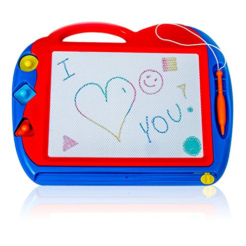EXTREMELY EASY TO USE: Our magnetic drawing board comes in a size that's easy to hold by children and equally easy to take along on a trip due to its small size. The magnetic drawing toy comes with a stylus that is attached to the board with the help of a string so that your children can't loose it somewhere. The fun part is erasing - simply slide the knob at the bottom of the screen and there you have a clear screen again.