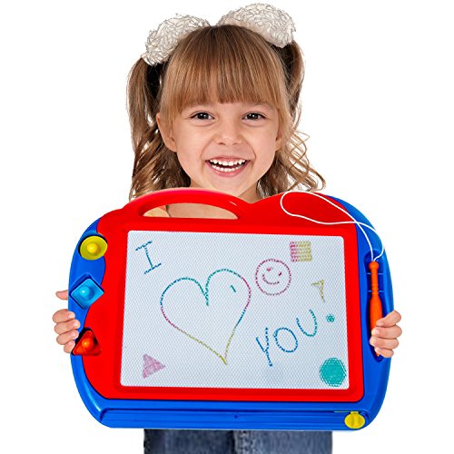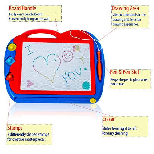 POWERHOUSE OF CREATIVITY: Our magnetic color doodle board is an amazing way to help unleash the creativity of young children - just hand it to them and see them draw their imagination, practice writing alphabets or use the stamps to create some amazing art. It's not only a drawing board for kids but can also be used by adults to play games like Tic-Tac-Toe, Pictionary, Hangman or any other puzzles.