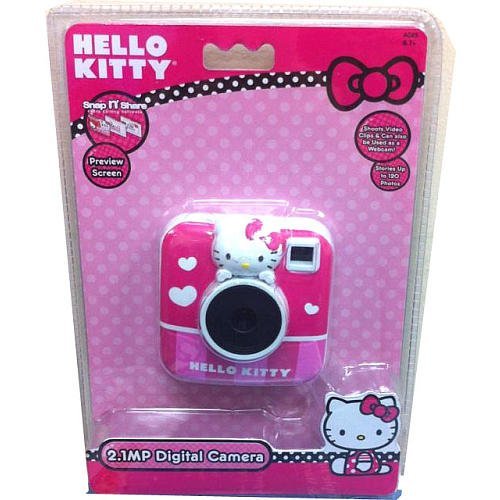 The 2.1 MP Hello Kitty Instagram Camera comes with a 1.5" preview screen. It shoots video clips and can be used as a webcam. Stores up to 120 photos. PACKAGE CONTENTS: Digital Camera, USB Cable, Snap n' Share Software CD, User Manual, Wrist Strap, Manufacturer's 1 Year Warranty.