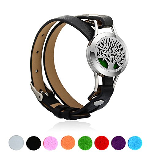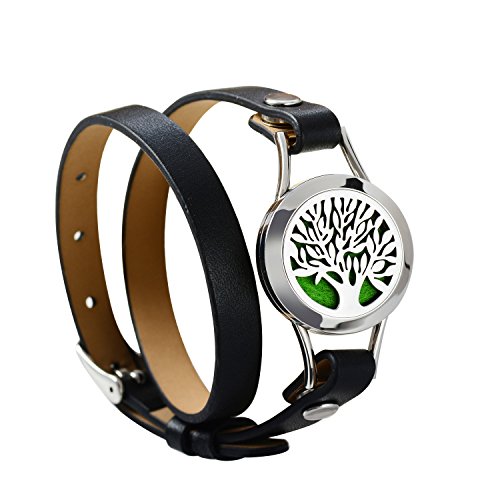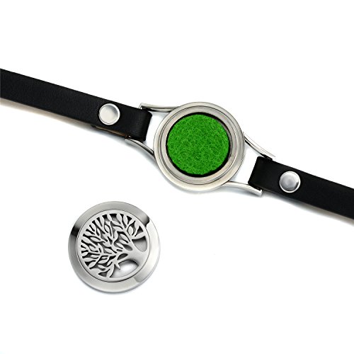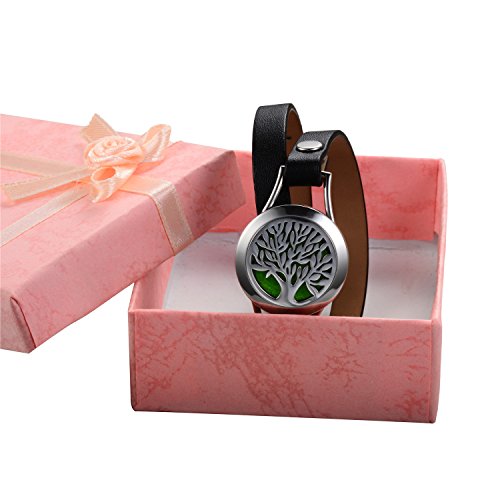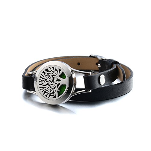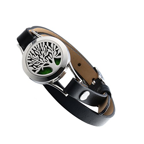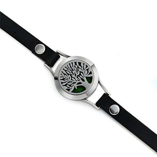 Pusheng Aromatherapy Essential Oil Diffuser Bracelet Tree of Life Stainless Steel Locket Bangle on PU leather Band,Adjustable