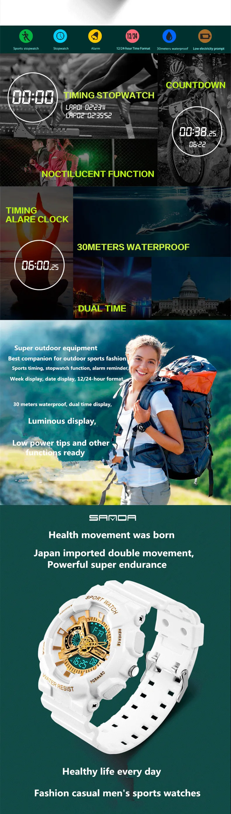 Feature:Water Resistant,LED display,Luminous,Stop Watch,Complete Calendar,Back Light,Shock Resistant
