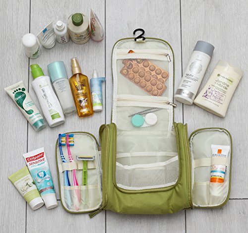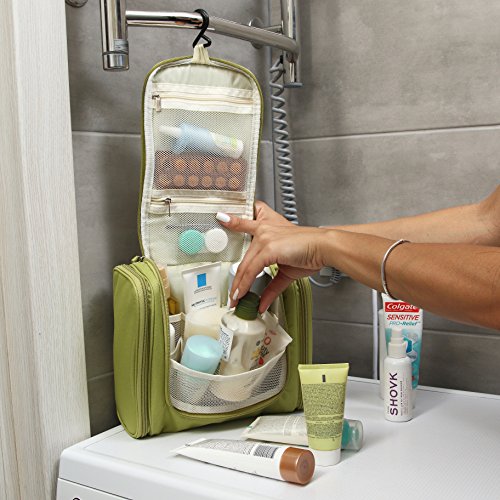 - COSMETIC BAG AND HANGING ACCESSORY – 2 in 1. Open the main section fully from two sides and take out the reliable hook-holder. Hang the travel toiletry bag on a durable hook, hitching it on a shelf, handle or holder. Now you can use hanging toiletry bag as a hanging organizer, where every item is in its place. All the personal things are at hand and still minimum space in the bathroom is taken. As a hanging organizer travel cosmetic bags are just indispensable on the road at a hotel.