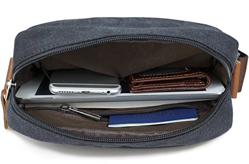 -. Feature : Measures: 10.24"(H) x 7.87"(L) x 3.94"(W) / Material: High-density pure cotton canvas and shoulder strap, leather trim; Lining:cotton cloth / Capacity: Fit for ipad, glasses, wallet, cell phone, keys, cigarette and more / Structure: Two cushion pads of the main compartment provide cushioning for your electronic devices / Excellent Design: Perfect for travel, excursion, school, working, shopping, dating and daily using