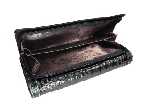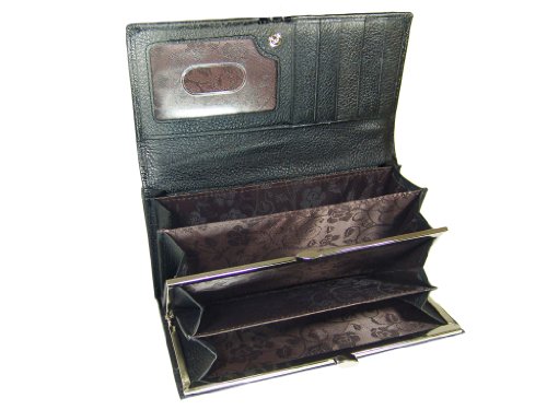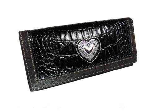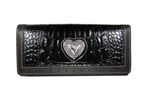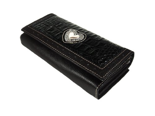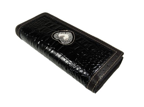 Product Description This gorgeous genuine leather western style wallet is perfect for all your needs. ? ?The animal skin fabricated black leather is contrasted with smooth dark brown leather trim and silver tone accents. ?It has multiple compartments for cash, credit cards, a picture and ID. 0