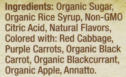 Ingredients: organic sugar, organic rice syrup, non-go citric acid, natural flavors, colored with red cabbage, purple carrots