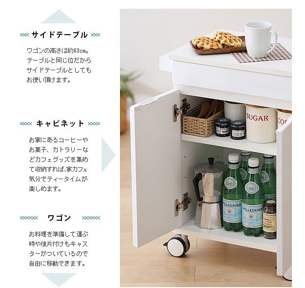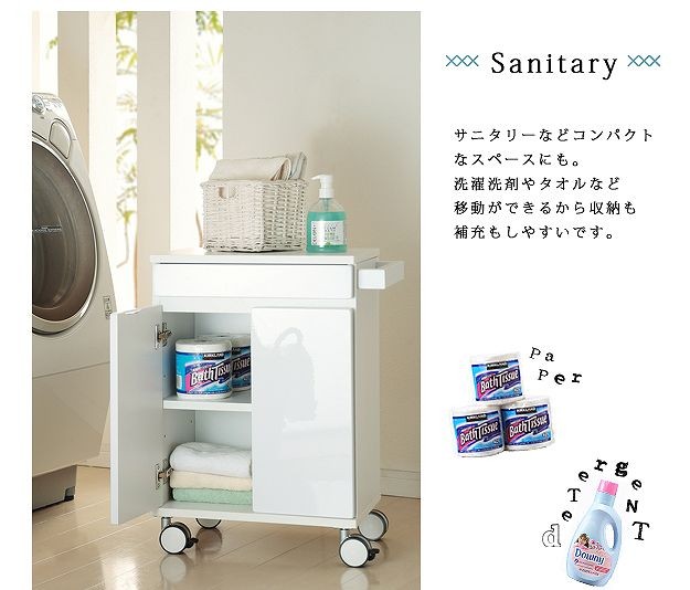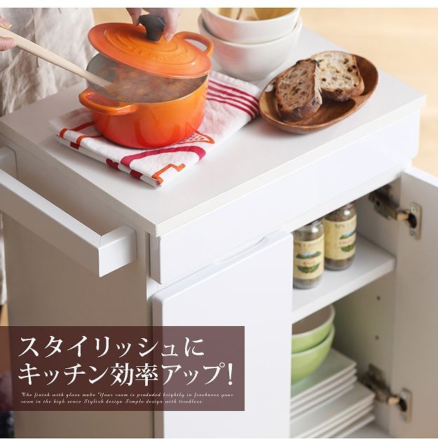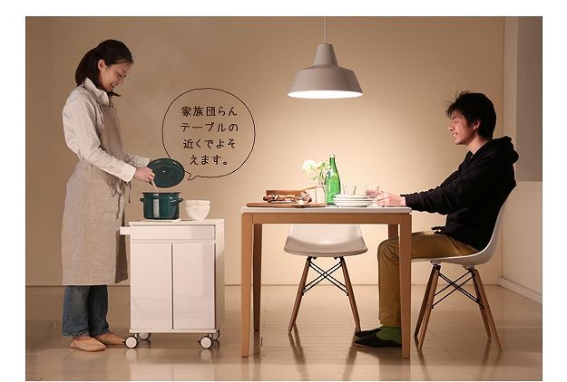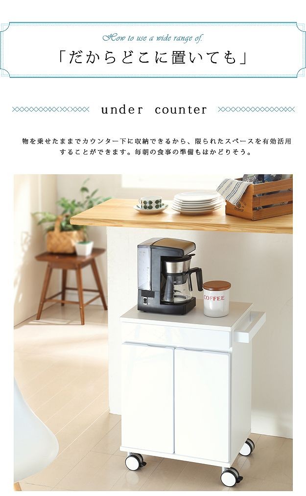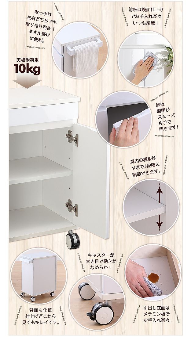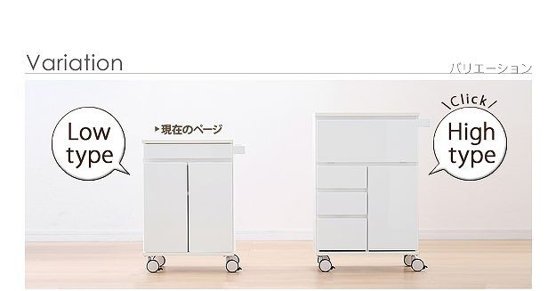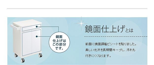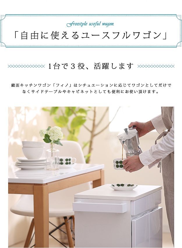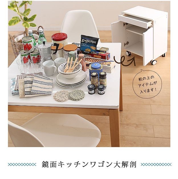 鏡面仕上げのキャスター付きキッチンワゴンロータイプ。ダイニングテーブル下にも収まる省スペース設計です。天板は熱に強いメラミン素材☆使い勝手だけではなく、キャスターや取っ手のデザインにもこだわりました。