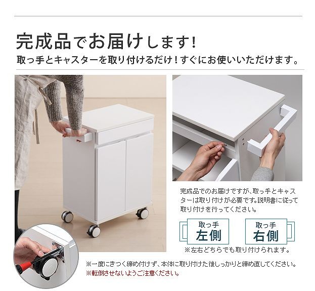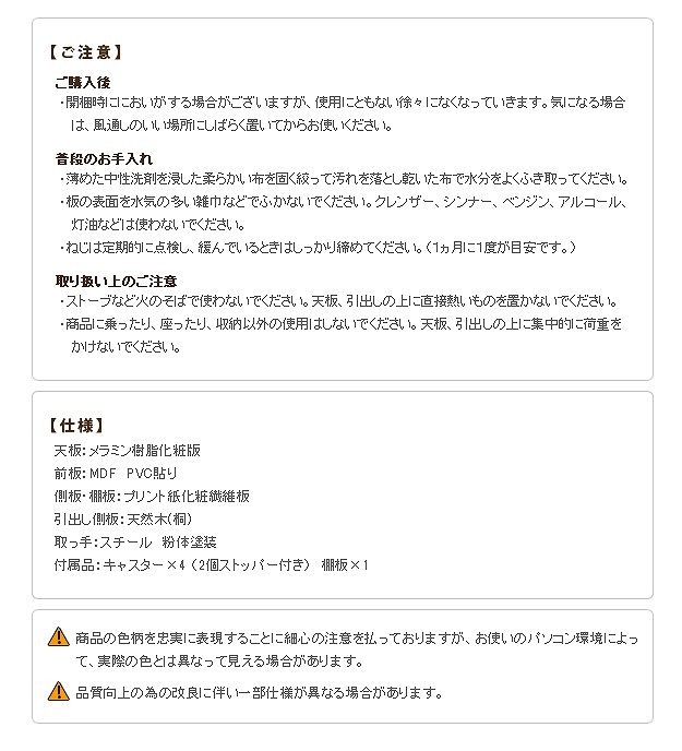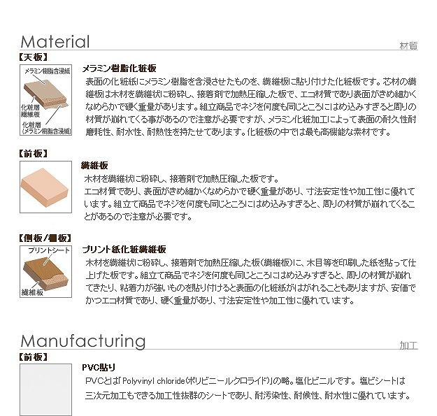 材質:天板-メラミン樹脂化粧板、前板-繊維板(PVC真空プレス)、側板・棚板-プリント紙化粧板、取っ手-スチール(粉体塗装)