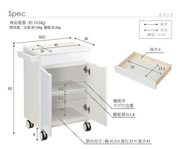 引き出し内寸-幅39x奥行23.5x高さ4cm、扉内内寸-幅41.5x奥行27x高さ46(間口41)cm、天板サイズ-幅45x奥行30cm