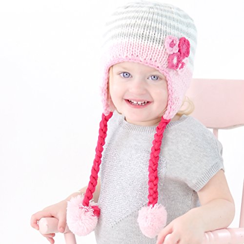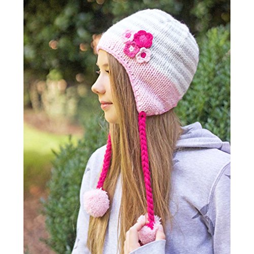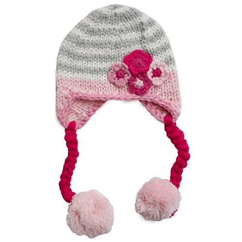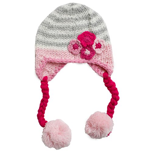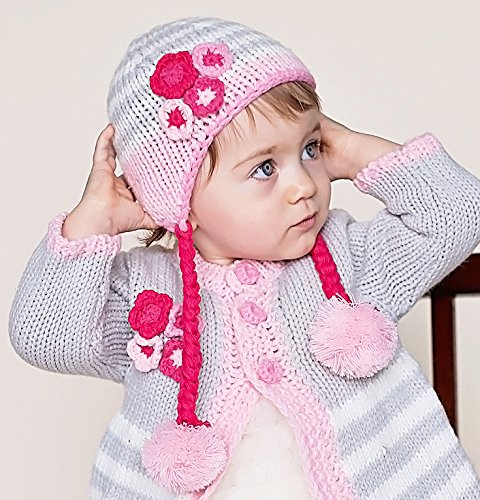 Binding : Apparel Product Description This cute cream and grey striped beanie has appliqued flowers in shades of pink in the corner and a baby pink brim with matching baby pink poms poms on fushia colored braids. Matching sweater, mittens and legwarmers also available for the complete look! 0