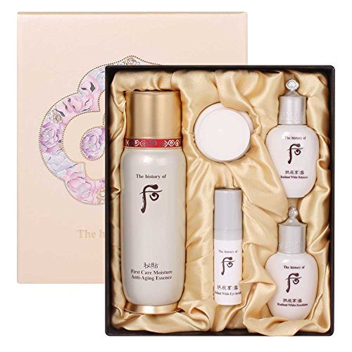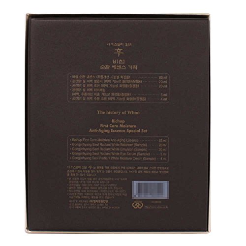 1. Bichup First Care Moisture Anti-Aging Essence - 85ml/2.87oz 2. Gongjinhyang:Seol Radiant White Balancer (Sample) - 20ml/0.67oz 3. Gongjinhyang:Seol Radiant White Emulsion (Sample) - 20ml/0.67oz 4. Gongjinhyang:Seol Radiant White Eye Serum (Sample) - 5ml/0.16oz 5. Gongjinhyang:Seol Radiant White Moisture Cream (Sample) - 4ml/0.13oz