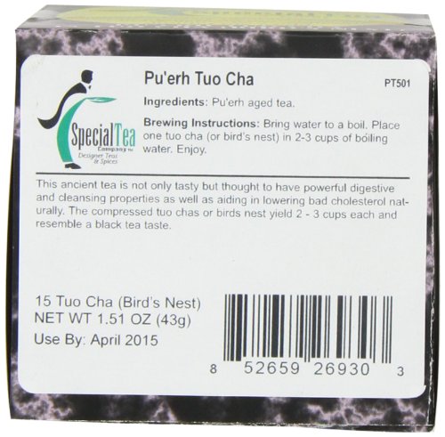 -. Binding : Grocery -. Brand : Special Tea -. EAN : 0852659269303 -. Feature : 20 superior tea bags per box. Your favorite whole loose tea leaves are freshly ground, gently sealed in oxygen bleached tea bags and conveniently boxed so every cup is easily brewed and absolutely delicious. / Quality loose teas. Whole loose tea leaves have all their essential oils intact, so the flavor, quality and health benefits are maintained. / Award-winning teas. The competitive World Tea Championships and North America Tea Championships have recognized many of our teas as the highest quality and best tasting teas in their categories. / Sealed in foil bags for freshness / Each box of tea is handmade in the USA -. Label : Special Tea Company -. Manufacturer : Special Tea Company -. Model : 852659269303 -. NumberOfItems : 1 -. PackageQuantity : 1 -. ProductGroup : Grocery -. ProductTypeName : GROCERY -. Publisher : Special Tea Company -. Studio : Special Tea Company -. Title : Special Tea Company, Pu'erh Tuo Cha 15 Bird Nests -. UPC : 852659269303