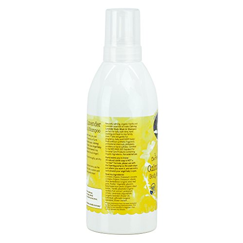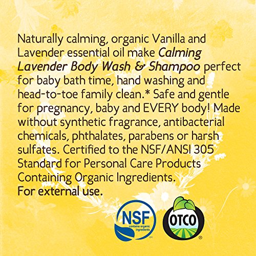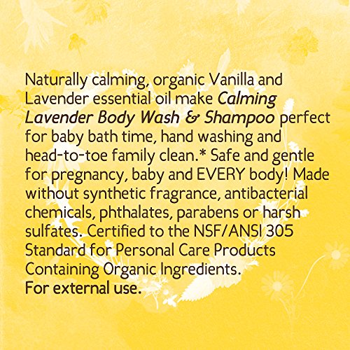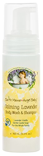 Sometimes you want a bath to clean, sometimes you want a bath to calm, sometimes you want both. Naturally calming, organic Vanilla and Lavender pure essential oils make Calming Lavender Shampoo and Body Wash perfect for a calming bubbly bath, hand washing and head-to-toe clean. Earth Mama's Safe, detergent-free all-natural and organic castile baby shampoo-soaps are body wash too, and contain no artificial foaming agents, sulfates, preservatives, parabens, dyes or fragrances. Certified organic by Oregon Tilth. Rated 0 for toxins on Skin Deep. Gluten-free. No artificial foaming agents ever: the clever pump bottle makes the pure castile soap fun and naturally foamy. Zero toxins means it's safe for pregnancy, baby and EVERY body. Economical too, each 5.3 oz bottle contains over 300 pumps. Calming Lavender Shampoo and Body Wash can be used to make homemade baby wipes too. Mama wants you to know. All-natural castile soap is NOT a "no-tear" formula, please use with the self-foaming bottle so the wash stays just where you want it, and use extra care around your angel baby's eyes. The pure castile soap formula means there's no need for artificial preservatives, foaming agents, emulsifiers or antibacterial pesticides. Certified by Oregon Tilth: NSF/ANSI 305 Certified Contains Organic Oils. No petrochemicals, petroleum or petroleum byproducts. No "fragrance" or parfum, 1,4-Dioxane, formaldehyde, or phthalates. No sodium lauryl sulfate (SLS), cocomidopropyl betaine or other synthetic foaming agents or surfactants. No artificial preservatives, parabens, phenoxyethanol, Quaternium-15 and more. No artificial emulsifiers.Feature