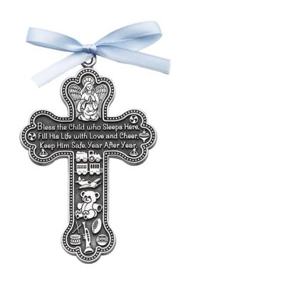 EXCLUSIVE PEWTER GUARDIAN ANGEL CRIB CROSS by Cathedral Arts with blue grosgrain ribbon will be a keepsake for years. Engraved with "Bless the child who lives here, fill his life with love and cheer, keep him safe year after year."