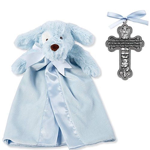 LOVELY BAPTISM BUNDLE of 2 gift items: Pewter "Bless the Child" crib cross and blue puppy lovie.