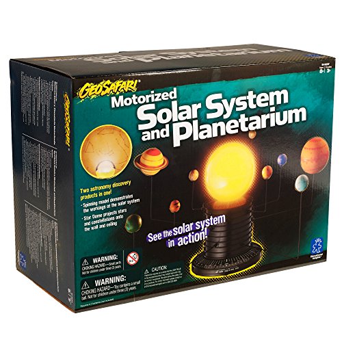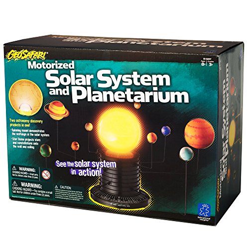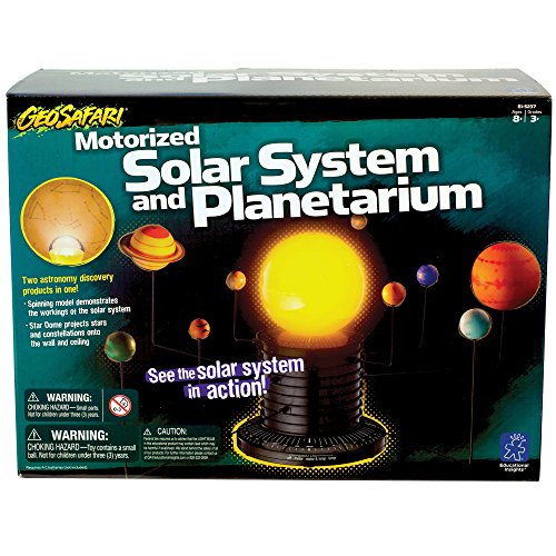 -. Binding : Toy -. Brand : Educational Insights -. Color : Multi -. Department : unisex-child -. EAN : 0885300998857 -. Feature : From an award-winning line of science toys that will launch a lifelong love of space exploration and introduce key astronomy concepts and terminology! / Convert any room into a planetarium with this spectacular orbiting solar system! / Includes a brightly lit sun, 8 rotating planets, and Pluto, the dwarf planet, all on a sturdy base. / Study the orbits and rotation of the planets or project the constellations onto your ceiling! / Requires 4 C batteries (not included) -OR- an AC adapter (sold separately). / Observe the vastness of space in a dramatic light show / Base features planetary longitude marks so the planets can be set up to their correct positions -. IsAdultProduct : 0 -. IsAutographed : 0 -. IsMemorabilia : 0 -. ItemPartNumber : EI 5237 -. Label : Educational Insights -. LegalDisclaimer : choking hazard-small parts. Not for children under 3 years. -. Manufacturer : Educational Insights -. Model : EI-5237 -. MPN : EI-5237 -. NumberOfItems : 1 -. PackageQuantity : 1 -. PartNumber : EI-5237 -. ProductGroup : Toy -. ProductTypeName : TOYS_AND_GAMES -. Publisher : Educational Insights -. ReleaseDate : 2007-06-01 -. Studio : Educational Insights -. Title : Educational Insights GEOSAFARI MOTORIZED SOLAR SYSTEM - Award-Winning Science Toys -. UPC : 086002052377 -. Warranty : 30 days Manufacture Defects