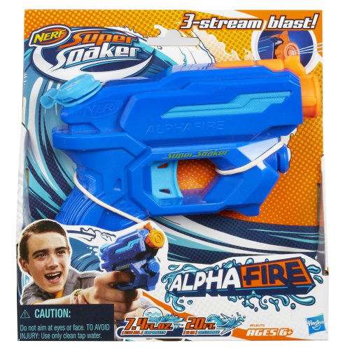 -. Binding : Toy -. Brand : SUPERSOAKER -. Color : multi/none -. Department : Unisex -. EAN : 0885935151511 -. Feature : High quality toys for children all ages / Made using safe materials / Tested for quality and durability / Compact water blaster lets you soak your target / 3-stream water blasting / Hit targets up to 20 feet away / Holds more than 7 ounces of water / Includes blaster and instructions -. IsAdultProduct : 0 -. ItemPartNumber : A5625 -. Label : Hasbro -. LegalDisclaimer : Do not aim at eyes or face. TO AVOID INJURY: Use only clean tap water. -. Manufacturer : Hasbro -. Model : A5625 -. MPN : A5625 -. PackageQuantity : 1 -. PartNumber : A5625 -. ProductGroup : Toy -. ProductTypeName : TOYS_AND_GAMES -. Publisher : Hasbro -. Size : NO SIZE -. Studio : Hasbro -. Title : Nerf Super Soaker Alphafire Blaster -. UPC : 885935151511 -. Warranty : No Warranty