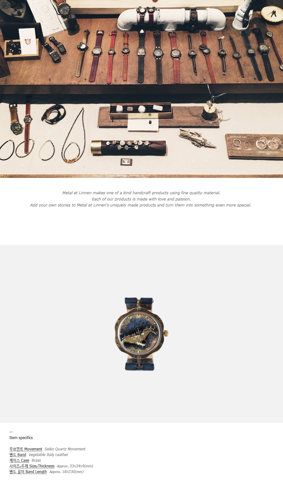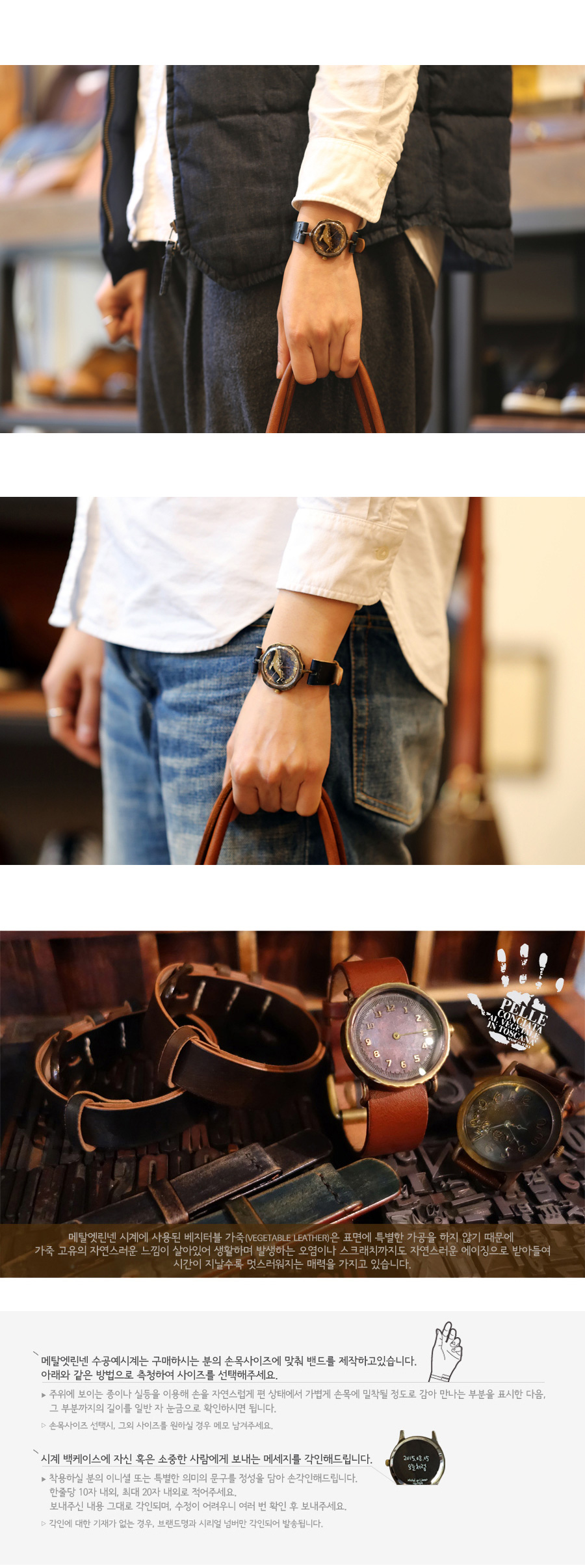 | Handcraft watch whaleBee(웨일비) 메탈엣린넨의 빈티지 황동(brass) 시계 케이스는 착용할수록 점점 밝아지며, 자연스러운 에이징이 되는 가죽 밴드와 함께 시간이 지나면 지날수록 사용자만의 빈티지한 시계가됩니다. 시계에 사용된 황동은 산화되면서 녹청(patina)이 발생할 수 있으나, 금속광택제(metal polishing compounds) 등으로 닦으면 다시 원래의 황동색을 되찾을 수 있으며 황동만의 독특한 소재감을 느끼실 수 있습니다. |