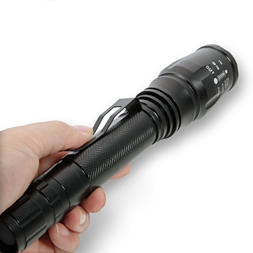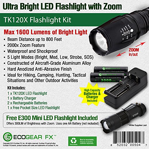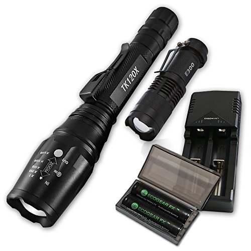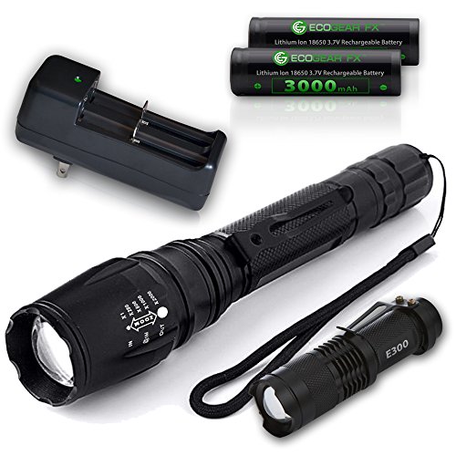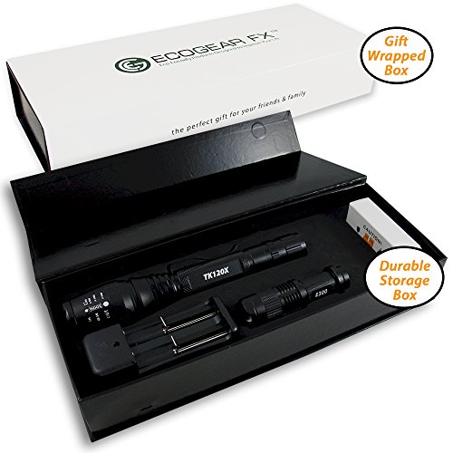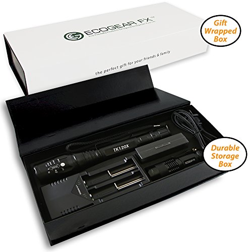 Professional Grade LED Flashlight Kit Brightest tactical LED flashlight with zoom delivering an excellent light spread and beam distance. Used by individuals and professionals for security situations, personal self defense and other outdoor activities. Perfect for tactical situations, camping, hunting, fishing and more . A great handheld LED emergency flashlight with rechargeable batteries to aid in emergency assistance, targeted search, police activities and an ideal flashlight for a survival gear kit.