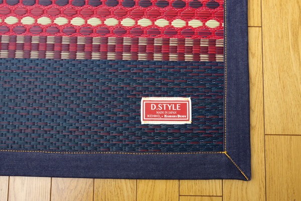 広島県福山市のデニム生地メーカー、カイハラ(株)の生地をヘリで使いました。イ草生地は袋織りという技法で繊細な柄を出しています。折れ曲がりが複雑なので長いイ草を使用しないと切れてしまいます。縦糸が密なので、しっかりとして破れにくいのが特徴です。国産(九州産)のい草を使用しています。一本一本が太く、表皮が厚く繊維がキメ細かいので弾力性があり、耐久性に優れています。い草には空気の自然浄化作用、湿度の調節作用などがあります。い草に青森ヒバ加工を施しています。(抗菌、防臭効果)