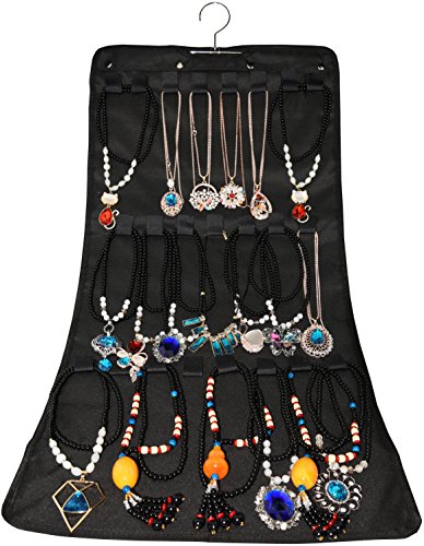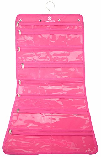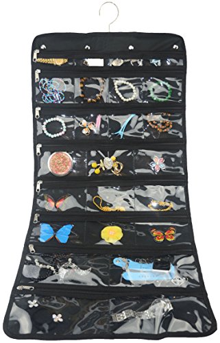 -. Feature : ✔ PUT EVERYTHING IN ITS PLACE: Forget messy jewelry boxes, missing earrings, tangled necklaces. This handy hanging jewelry organizer will help you to sort, store and display your jewelry and never waste another minute looking for misplaced rings digging through impractical jewel boxes. / ✔ TOP QUALITY MATERIALS: Freegrace's sturdy hanging jewelry organizer is made of premium 600D polyester Oxford fabric and has a PU backing (SIZE: 32.7'' x 16.5''). The pockets are made of transparent PVC to allow you to see through to the stored jewelry, and the zipper and revolving metal hanger are well-made and durable. / ✔ DESIGNED FOR PRACTICALITY: The jewelry organizer can be hanged for ease of use or folded and zipped shut for storage. On its one side there are 25 transparent pockets of varying sizes to hold your ring, earrings pins and other small pieces of jewelry. The other side has 23 velcro loops to accommodate your necklaces. See? Everything will finally find its place! / ✔ 2 VERSIONS TO CHOOSE FROM: In addition to the pockets/loops version, we offer an alternative hanging jewelry organizer with transparent pockets on both its sides - that's 50 storage pockets! Choose whichever fits you and put all your rings, earrings, lockets, necklaces, watches, brooches, pins and other jewelry in order! / ✔ 100% SATISFACTION GUARANTEE: Our premium hanging jewelry organizers are made with the best quality materials and great craftsmanship. We have absolute confidence in them! If, however, you are not as excited, there's no reason to worry; we offer you a 90-day money back warranty to guarantee your satisfaction!