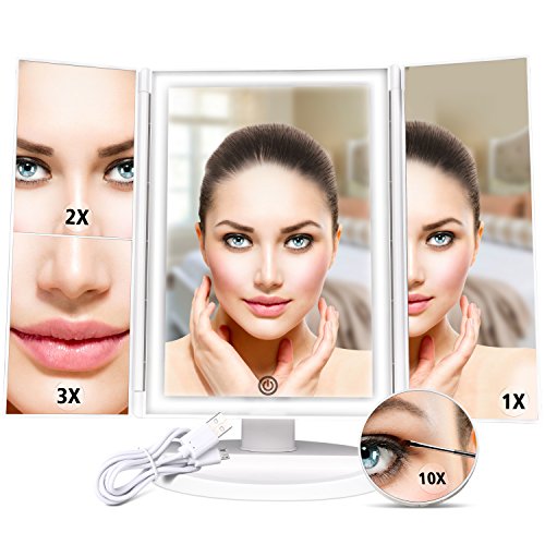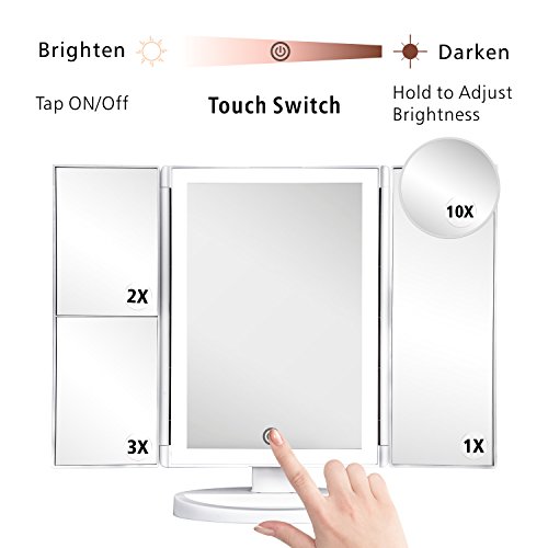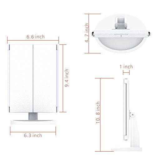 - 3 Magnifications: 10x/3x/2x magnidications achieve all your daily facial care needs like tweezing, shaving or do your makeup; with tri-fold 3 panels, this led vanity mirror provides both front and sides views for you to see clearly every details on your face; Perfect Travel Size of 13.2 x 9.4 inch when completely open