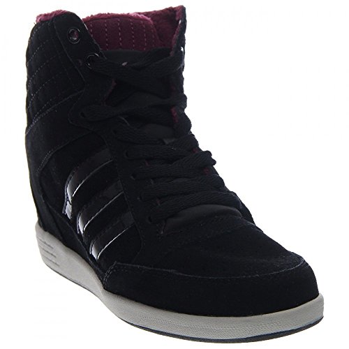 Synthetic suede upper with quilted collarFaux fur lining for comfortShiny enamel 3-Stripes and heel pieceHidden 65 mm heel wedgeGrippy rubber outsole for traction