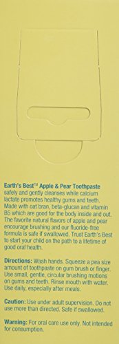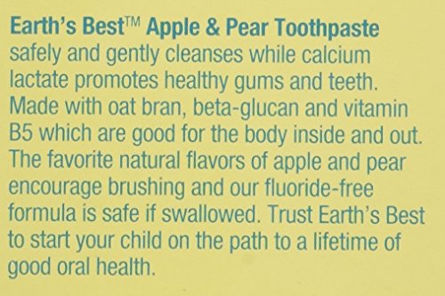 ReleaseDate : 2015-02-10 Studio : The Regatta Group DBA Beauty Depot Publisher : The Regatta Group DBA Beauty Depot Binding : Health and Beauty Product Description This fluoride-free Earth's Best Toothpaste Apple Pear is made with all natural flavors plus calcium lactate to safely and gently cleanse delicate gums and promote strong teeth. Safe if swallowed. Earth's Best's organic products help your child skin and hair feel soft and healthy as well as protect the earth so future generations have a healthy world to grow up in. 0